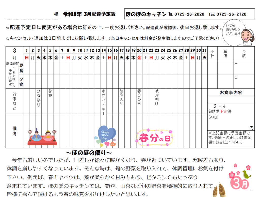 2026年2月12日 / 最終更新日時 : 2026年2月12日 yamaoka 未分類 3月配達予定表 Follow me! FacebookXHatenaPocketCopy コメントを残す コメントをキャンセルメールアドレスが公開されることはありません。 ※ が付いている欄は必須項目ですコメント ※ 名前 ※ メール ※ サイト 次回のコメントで使用するためブラウザーに自分の名前、メールアドレス、サイトを保存する。